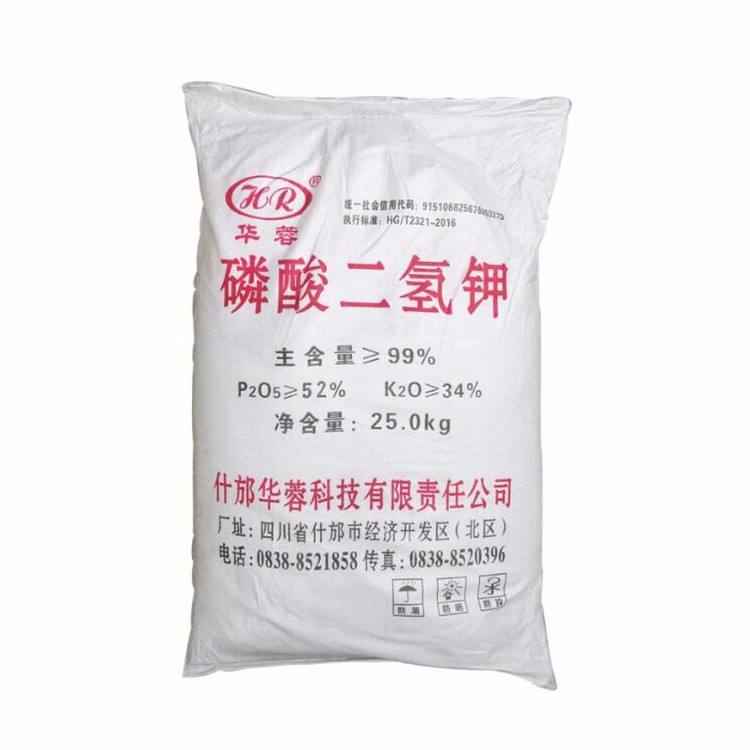 2.農業上用作高效磷鉀復合肥;磷酸二氫鉀產品廣泛適用于各類型經濟作物、糧食、瓜果、蔬菜等幾乎全部類型的作物,各省均由當地的農科院所、土肥站等專家機構針對磷酸二氫鉀適用于各類典型作物進行了很多的相關應用實驗,通過各地對各類型作物的實際施用效果證明磷酸二氫鉀具有顯著增產增收、改量優化品質、抗倒伏、抗病蟲害、防治早衰等許多優良作用,并且具有克服作物生長后期根系老化吸收能力下降而導致的營養不足的作用。磷酸二氫鉀屬新型高濃度磷鉀二元素復合肥料,其中含五氧化二磷52%左右,含氧化二鉀34%左右。烤煙需磷、鉀量大,特別是需鉀量大。磷酸二氫鉀是用于烤煙的一種較為理想的新型肥料。為了探索磷酸二氫鉀在烤煙上的使用價值和施用方法,以提高煙葉品質。磷酸二氫鉀用在棉花上能夠控制棉花徒長,增加植株花苞數量。磷酸二氫鉀廣泛運用于滴管噴灌系統中。