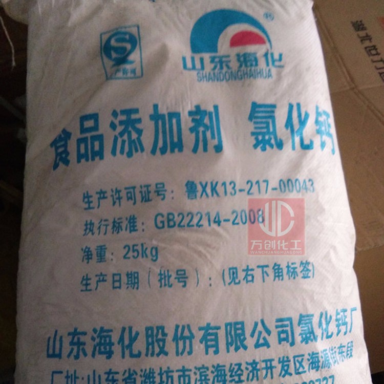 氯化鈣作為固化劑,可用于蔬菜罐頭。它還能使大豆凝乳固化形成豆腐,又能作為烹飪分子美食的原料通過與海藻酸鈉反應使蔬菜和水果汁表面膠化形成類似魚子醬狀的小球。作為電解質添加到運動飲料或一些軟飲料包括瓶裝水中。由于氯化鈣本身有非常強的咸味所以可代替食鹽用于腌黃瓜的制作同時又不增加食物鈉含量的效果。氯化鈣可降低冰點的屬性在填充有焦糖的巧克力棒中被用來延緩焦糖的凍結。